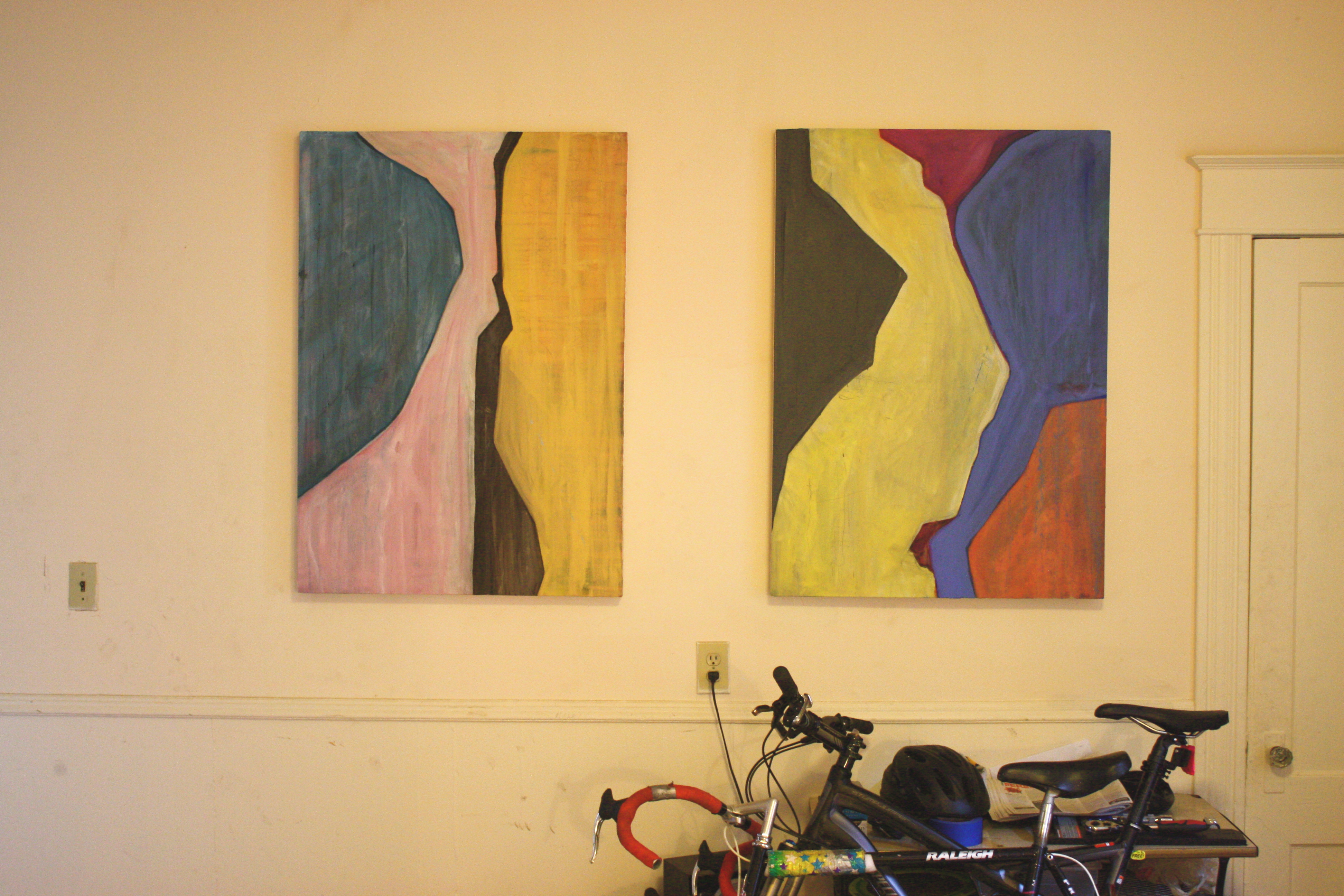 I recently gave this twosome natural light and brought them to a more open space in which to observe their whereabouts in a new manner. A gathered these stretchers from old paintings of mine and just went over what was already there. A lot of change has occurred in their process and here’s where they ended up. It was a long road really to find this place, but I like it and I think I’ll stay for a while. If you want to see them close up, as well as a few others from this year, hop into the painting link.