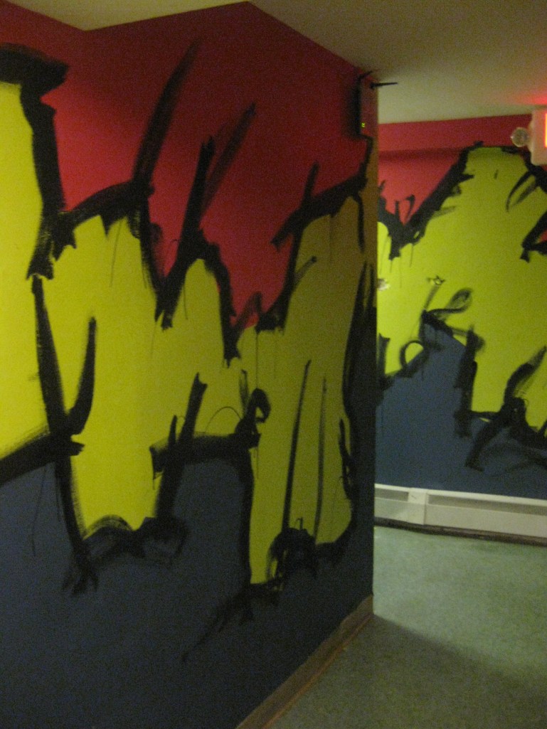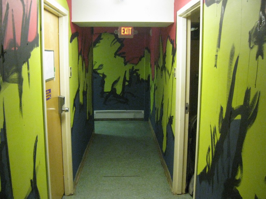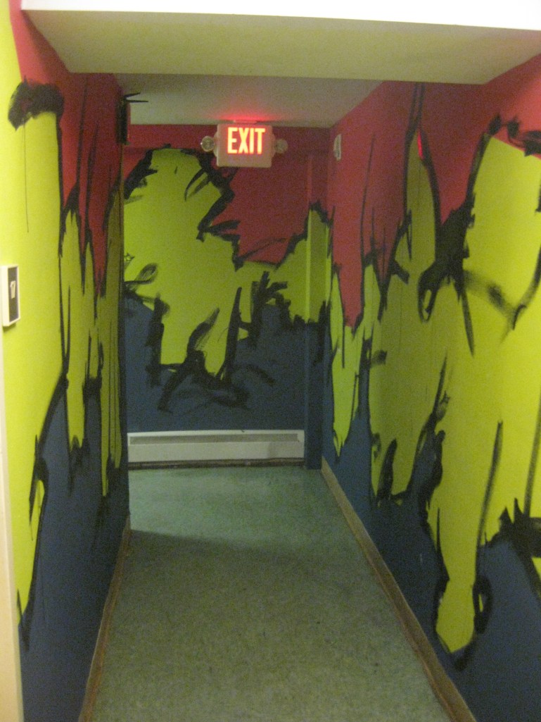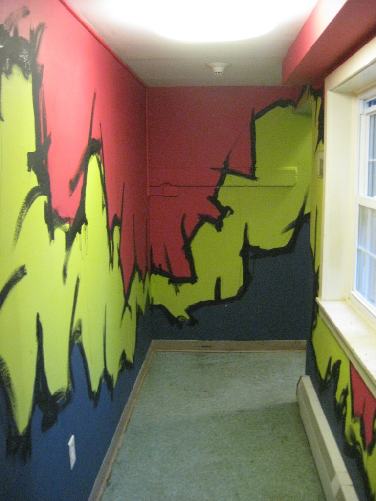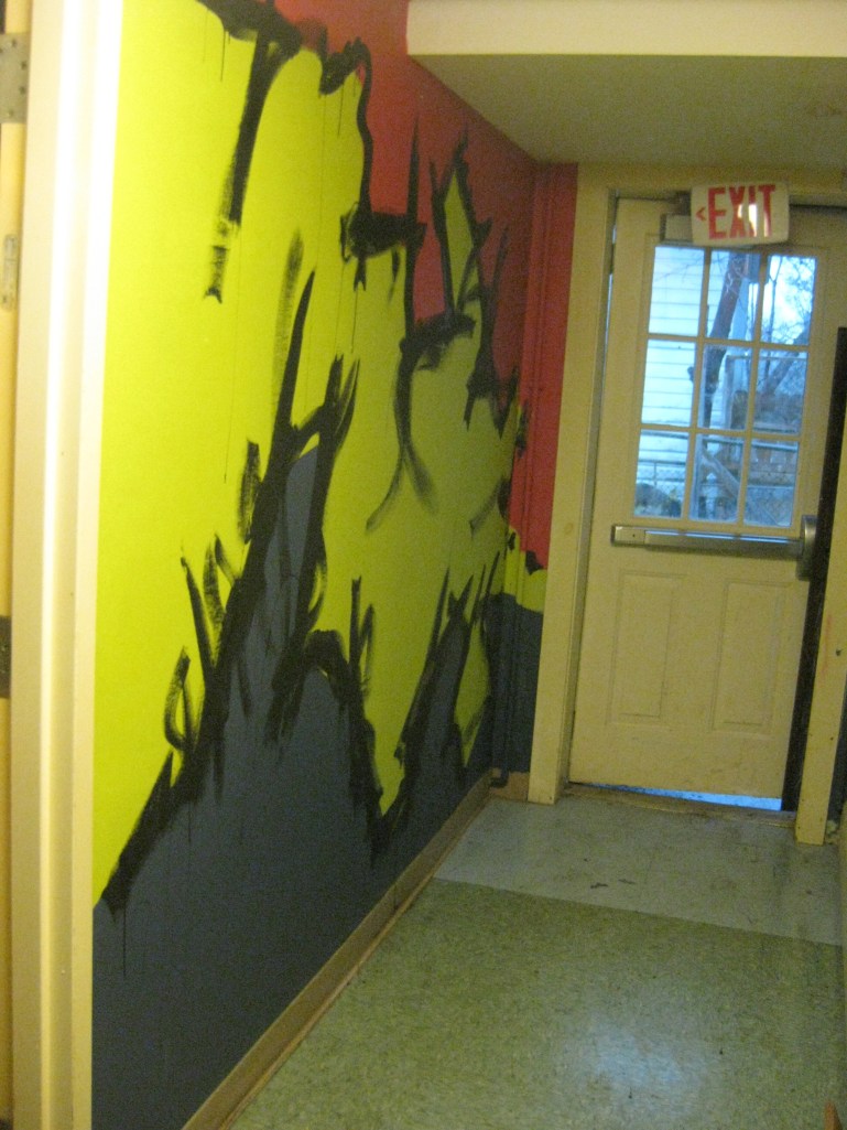 Upstairs in another room, my friend Alex Eaton painted the common room with some mountains and trees. The colors are very different, but I wanted to say in line with his… well line. Craggy mountain lines were on my mind as friends like April Costa and Alex Comeau helped tape edges for the color boarders. In the end I had to do some quick black lines, mostly because it was super fun and also that it gives it a little more flare and looks a lot more swampy.
