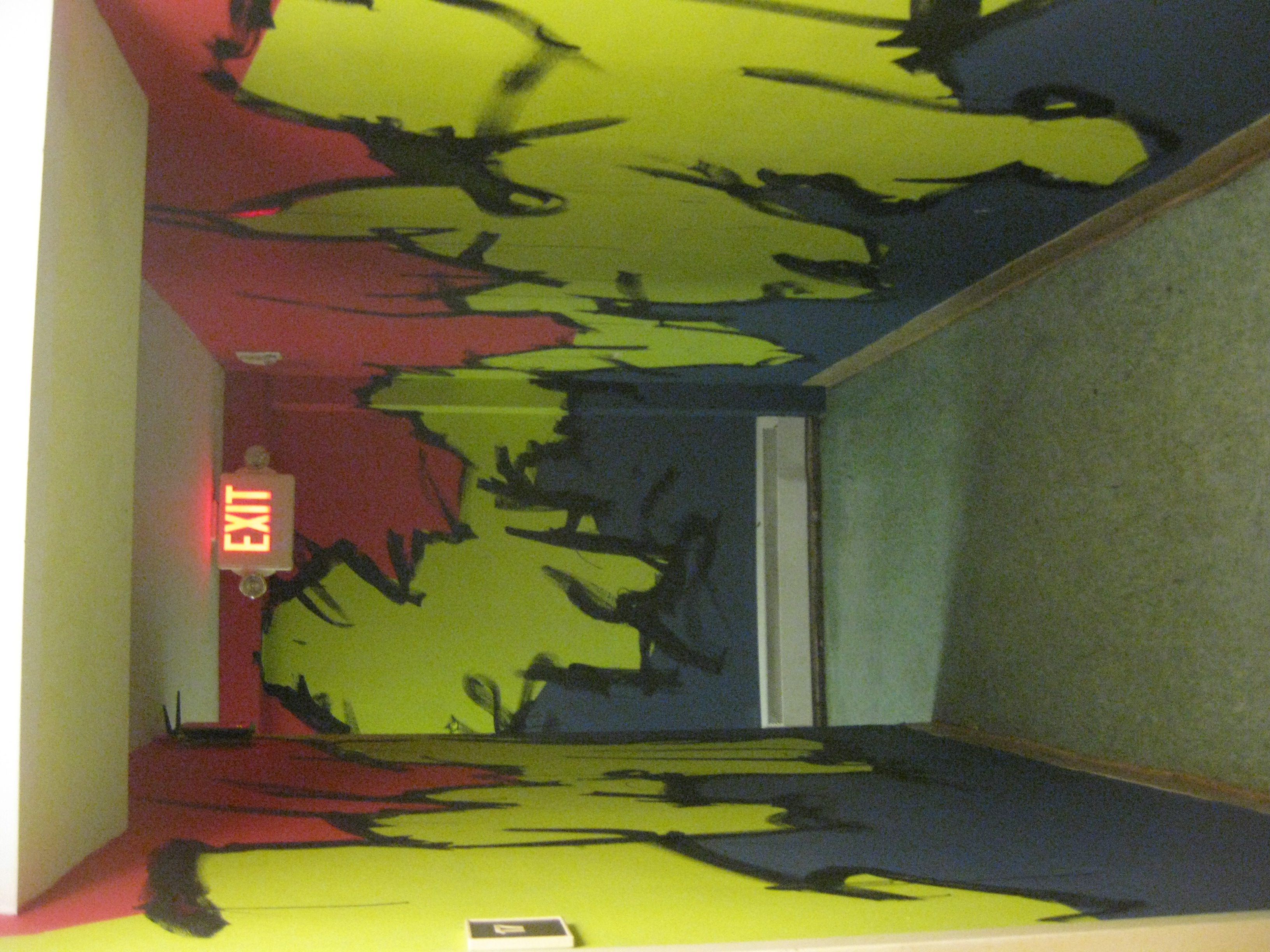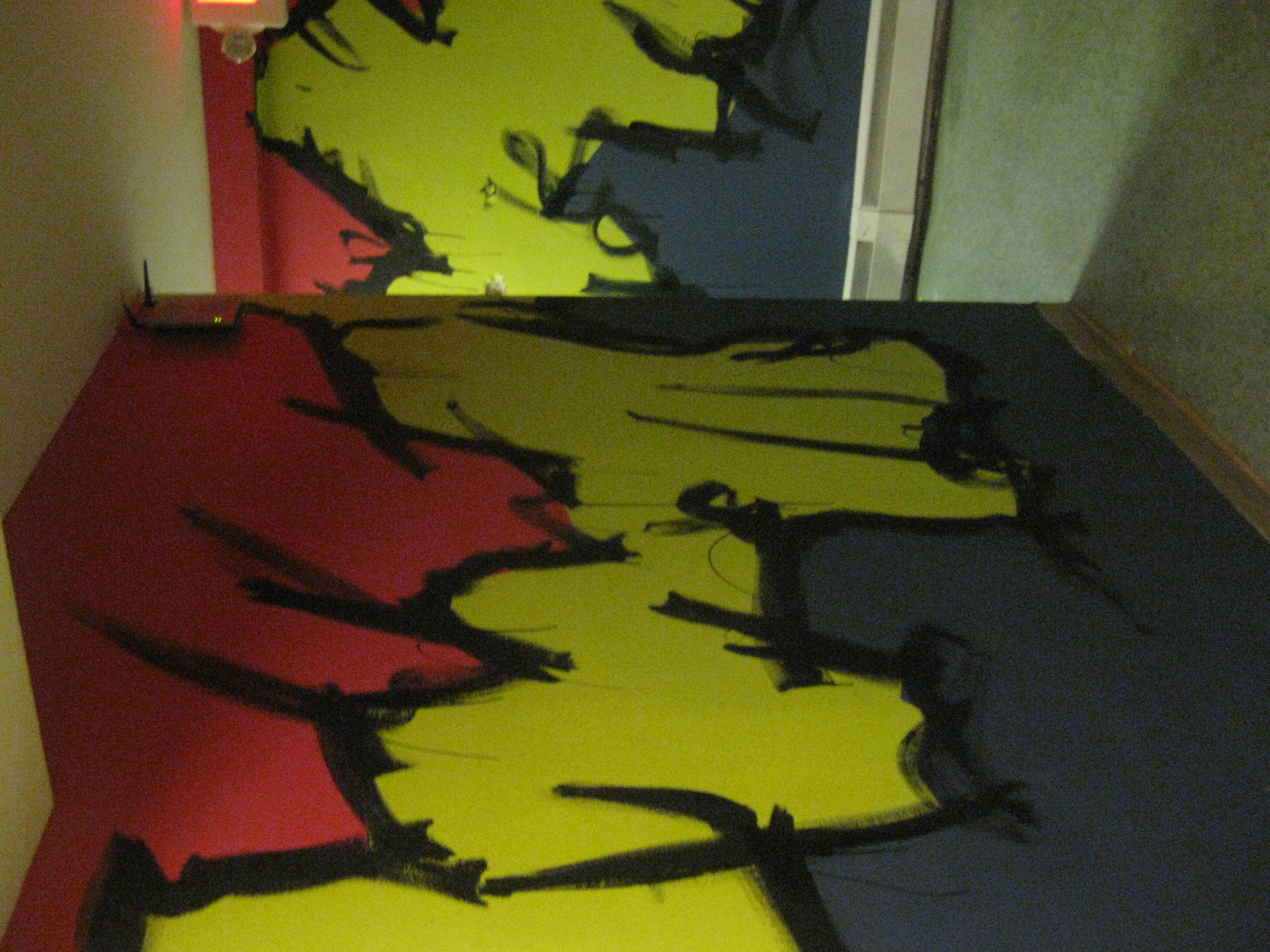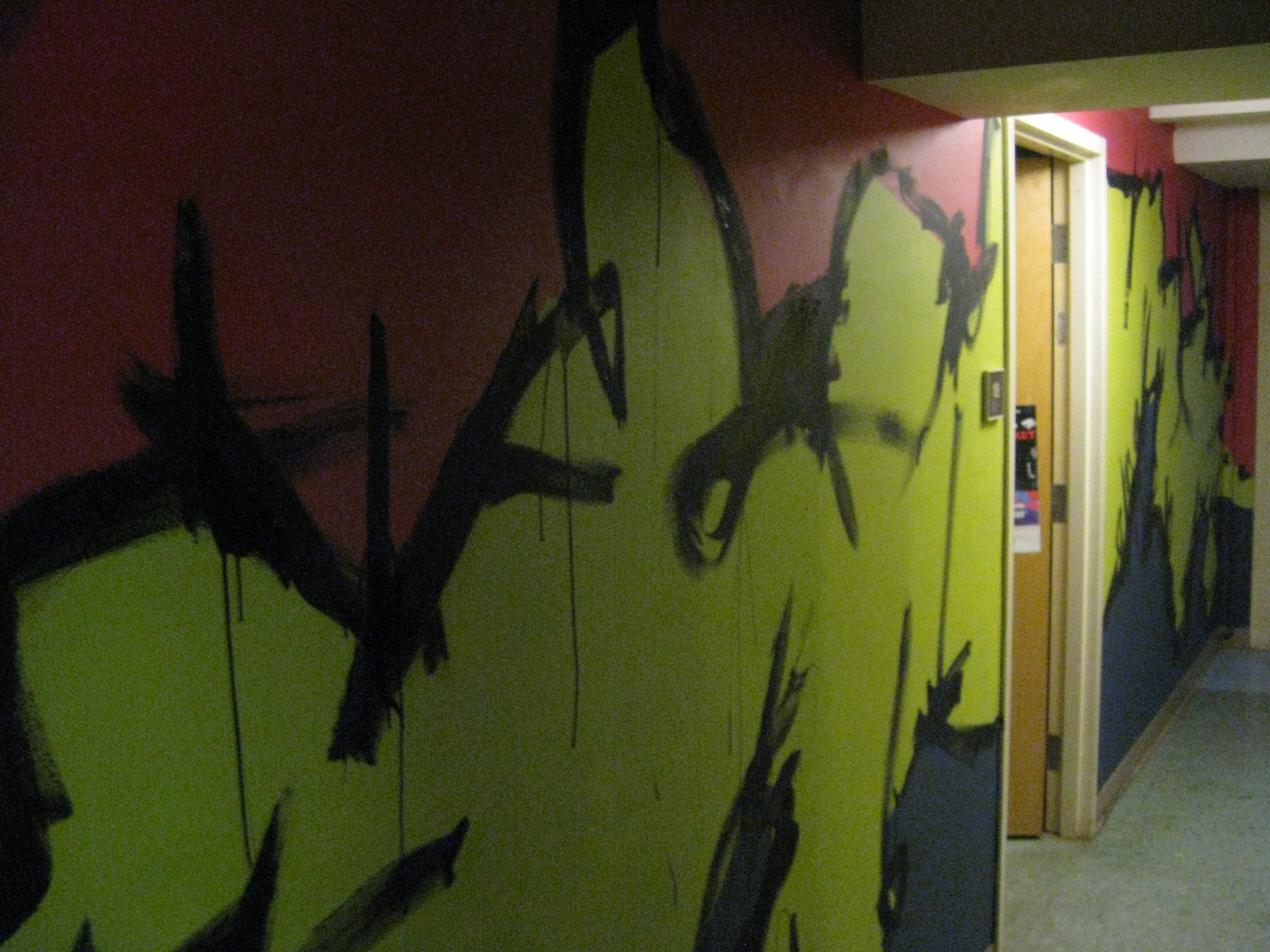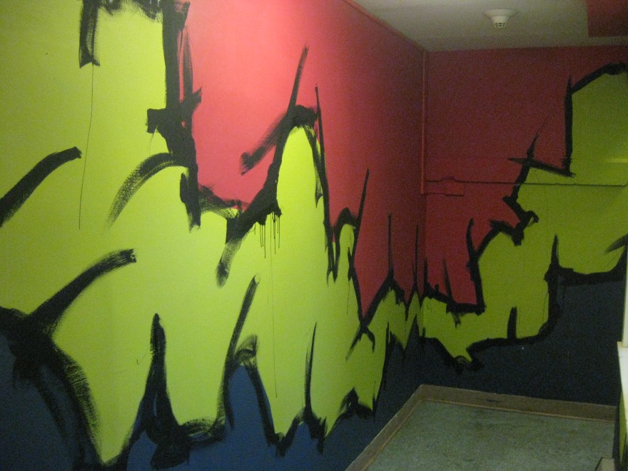 Upstairs in another room, my friend Alex Eaton painted the common room with some mountains and trees. The colors are very different, but I wanted to say in line with his… well line. Craggy mountain lines were on my mind as friends like April Costa and Alex Comeau helped tape edges for the color boarders. In the end I had to do some quick black lines, mostly because it was super fun and also that it gives it a little more flare and looks a lot more swampy.